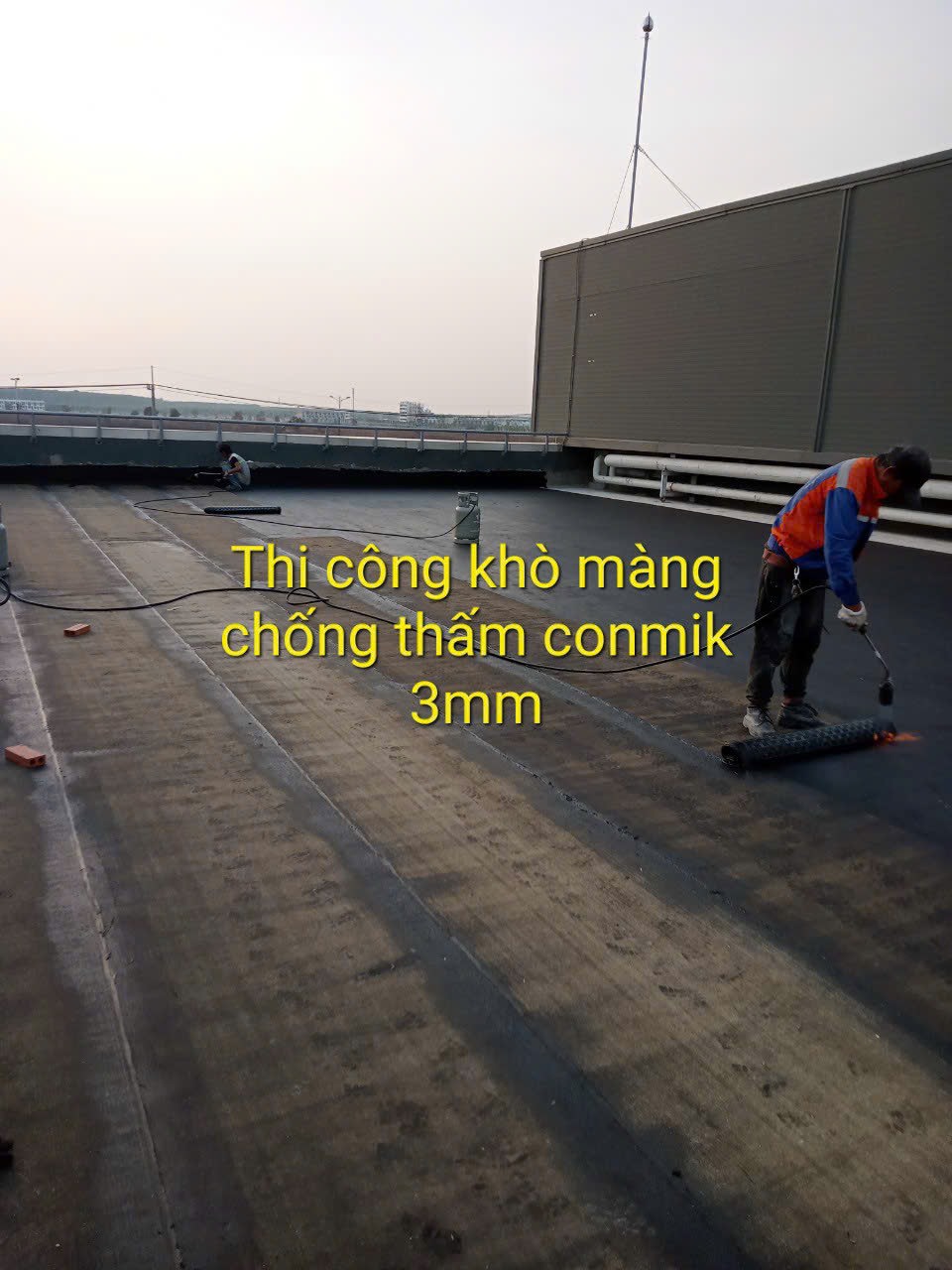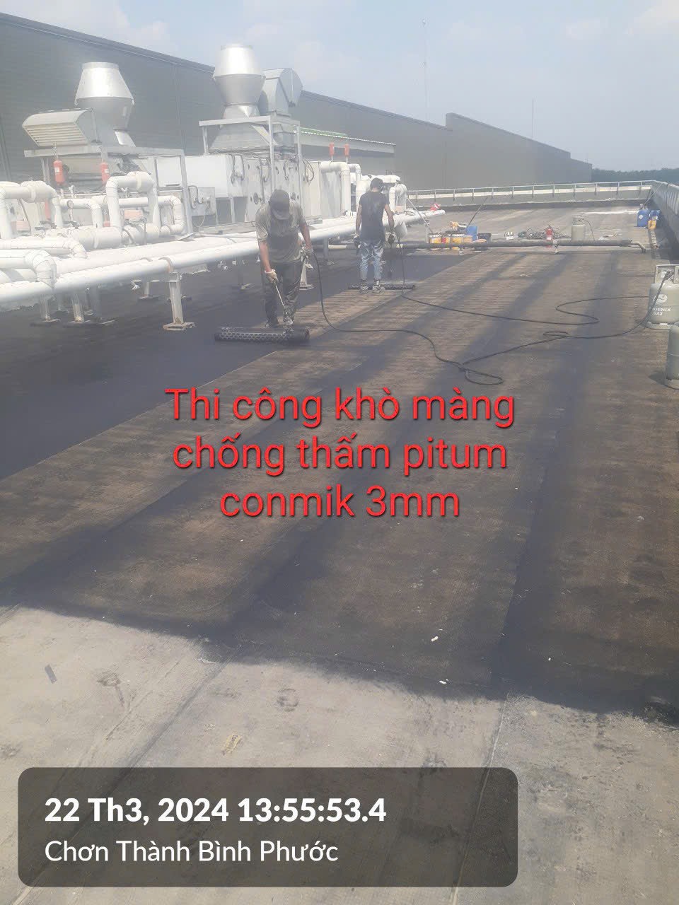 Chống thấm sàn mái với diện tích lớn ~1000 m2. Sử dụng màng khò pitum conmik.